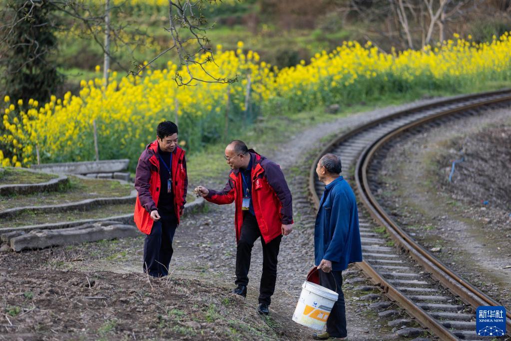 3月14日,在菜子坝站,“张火痴”(左)和负责小火车运营管理的同事邓强(中)、当地村民讨论嘉阳小火车铁路沿线种植花卉的事情。