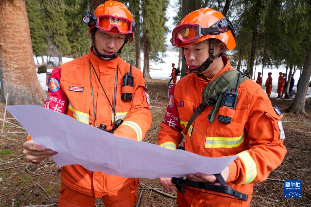 3月15日,巩留县森林消防大队大队长尤红超(左)和同事在林区查看地形。