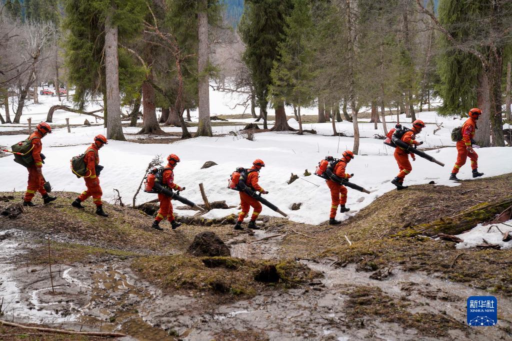 3月15日,巩留县森林消防大队指战员在库尔德宁林区内行进。
