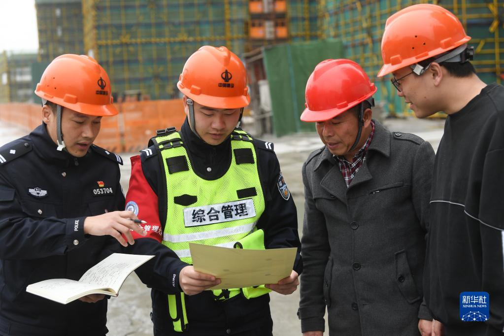 3月16日,在湖州吴兴区八里店镇,警源联治工作站的民警和辅警对工地工人进行流动人口登记。