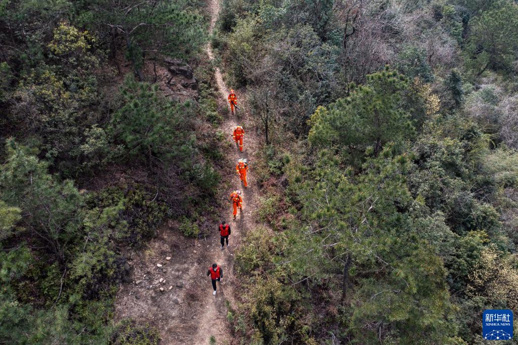 3月16日,道场乡综合森林火灾应急救援队队员和党员志愿者一同巡查辖区林区森林火灾隐患(无人机照片)。