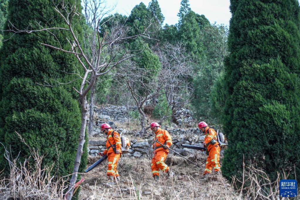 3月15日,长清区国有莲台山林场防火中队队员在林区巡护。