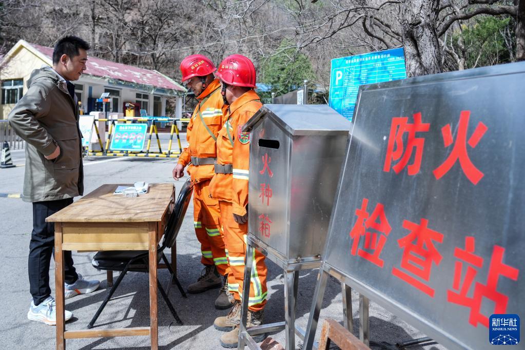 3月15日,长清区国有莲台山林场防火中队队员在林区入口检查火源。
