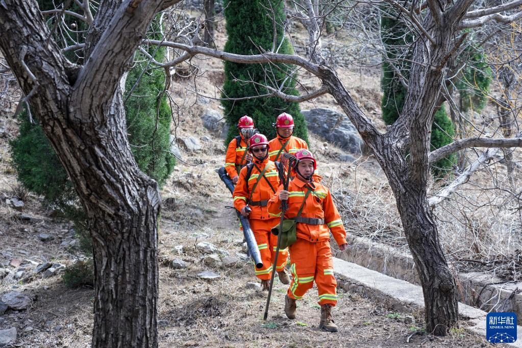 3月15日,长清区国有莲台山林场防火中队队员在林区巡护。