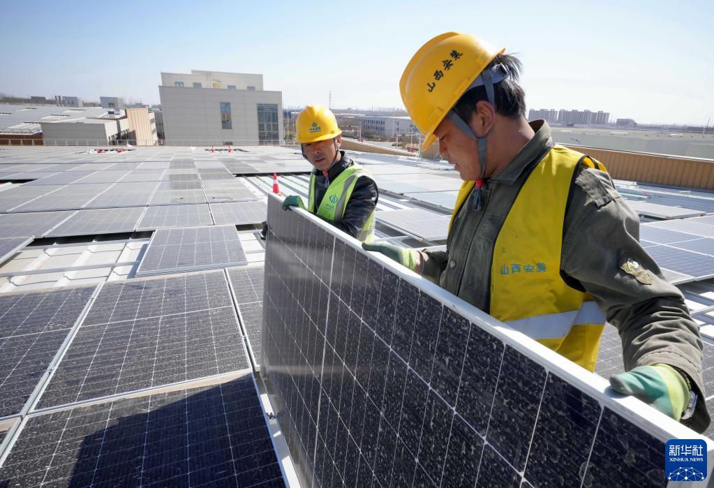 3月16日,工人在唐山市芦台经济开发区一家企业厂房屋顶上安装太阳能光伏发电板。