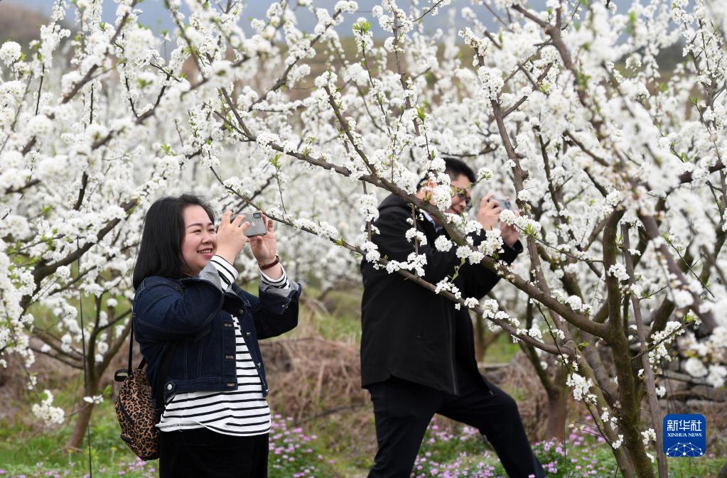 眼下,广西金秀瑶族自治县忠良乡巴勒村李花绽放,吸引游客前来踏春赏花。