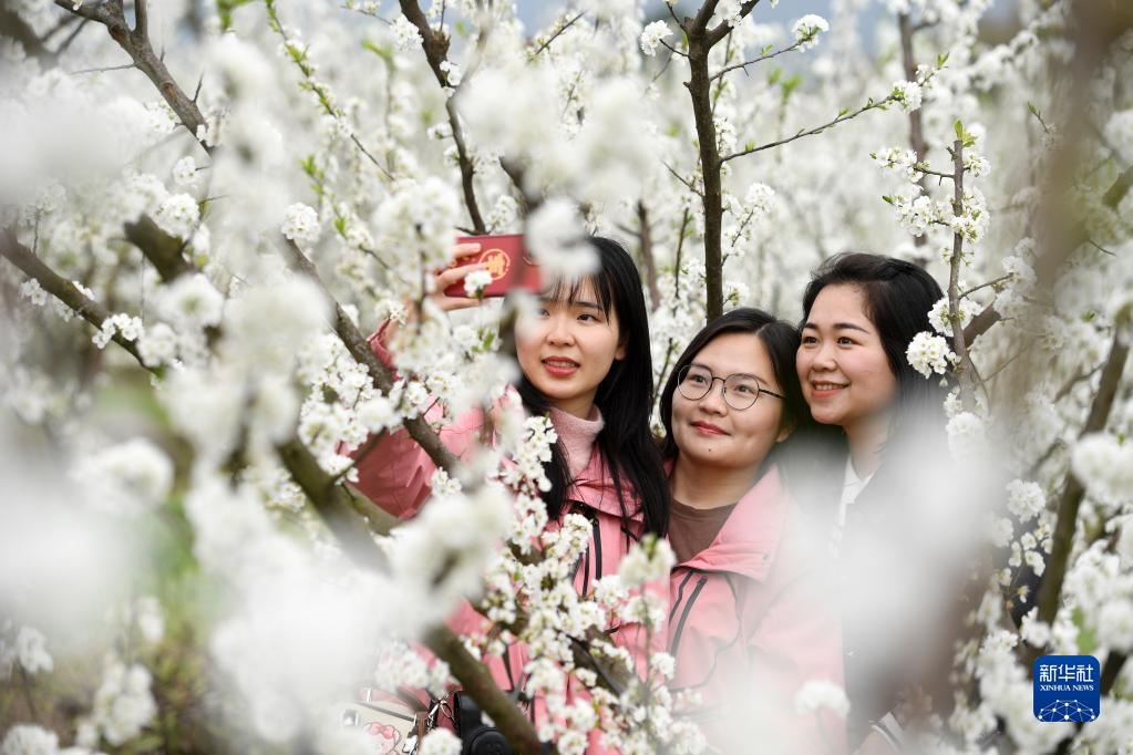 眼下,广西金秀瑶族自治县忠良乡巴勒村李花绽放,吸引游客前来踏春赏花。