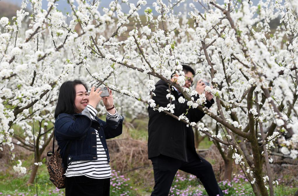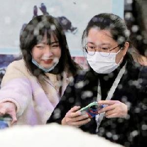 3月17日,参会者在2023哈尔滨冰雪博览会上参观飘雪机设备。