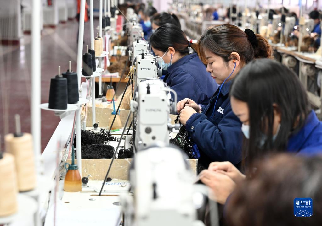 3月16日,工作人员在河南瑞贝卡发制品股份有限公司的生产车间里制作假发。