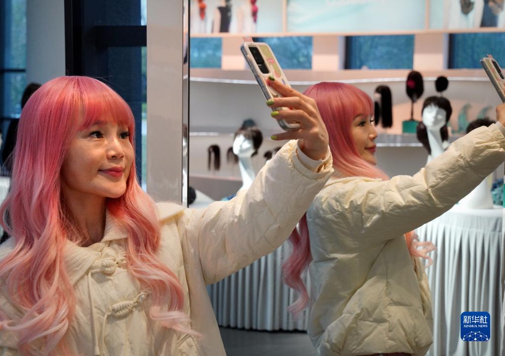 3月16日,市民在河南瑞贝卡发制品股份有限公司的展厅内试戴假发。