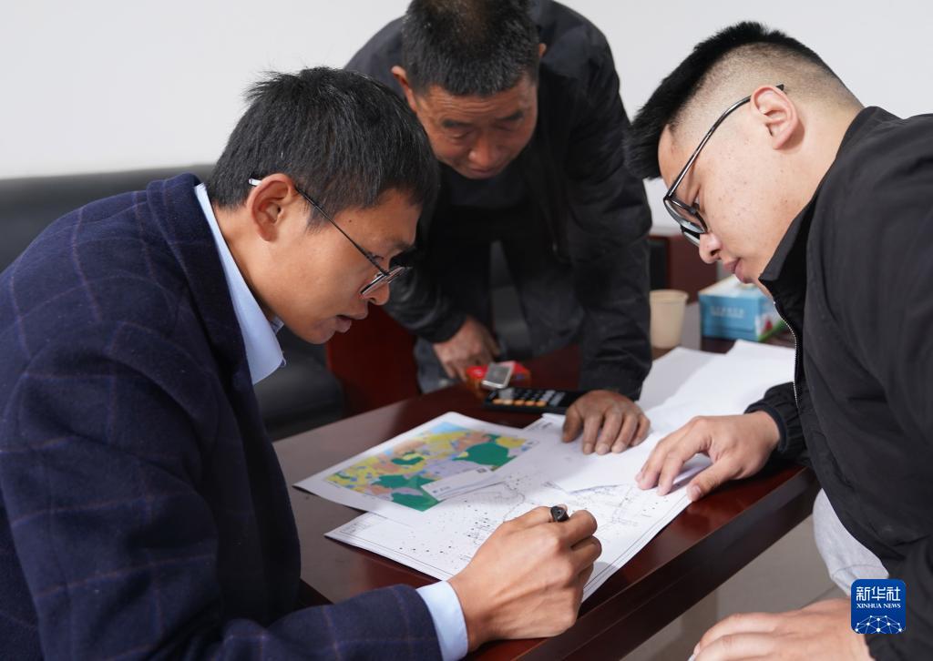3月17日,张必超(左)在办公室内与设计单位工作人员沟通现代化农事服务中心工程事宜。