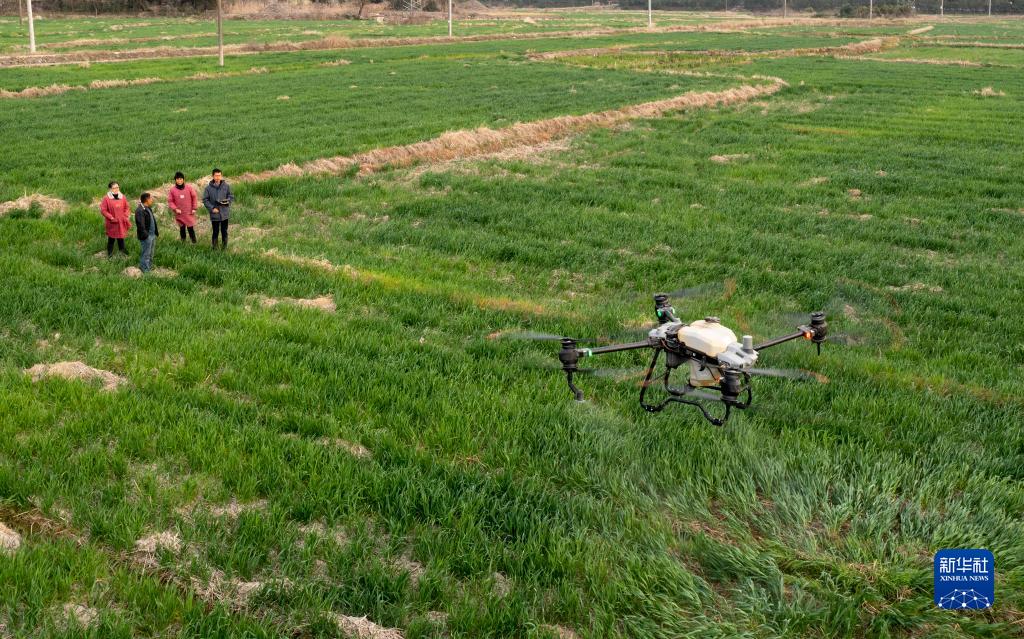 3月16日,张必超(右一)在诸暨市浣东街道太和村操作植保无人机,为一户村民的农田撒药(无人机照片)。