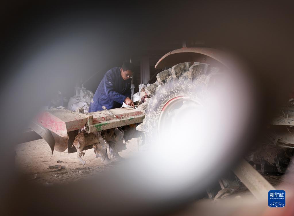 3月16日,张必超在诸暨市里联农机专业合作社维修农机。