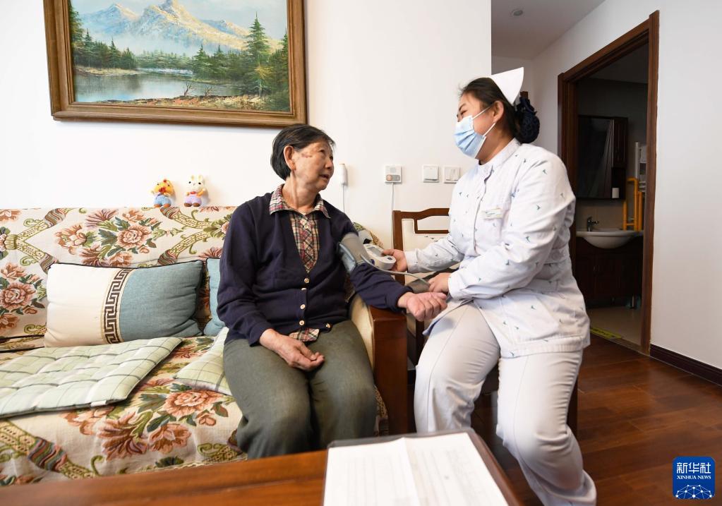 3月17日,三河市燕达金色年华健康养护中心家居区值班护士为老人做健康监测。