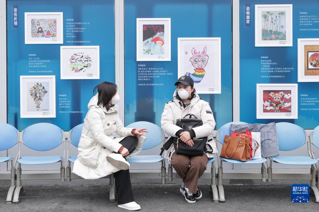3月17日,人们在北京大学人民医院《罕见的梦》公益画展的展品前交谈。