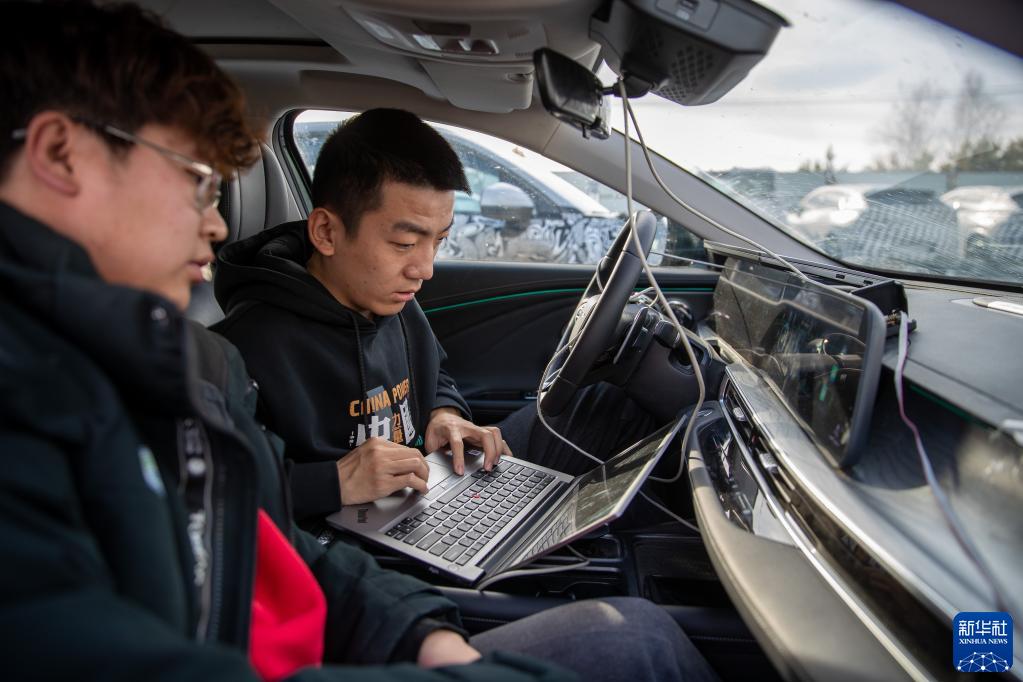 3月17日,在漠河红河谷寒地试车基地,工作人员在调整车辆数据。