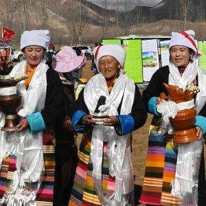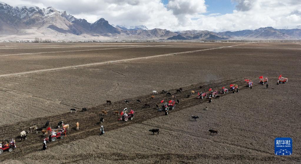 西藏拉萨市林周县强嘎村的春耕仪式现场(无人机照片,3月16日摄)。