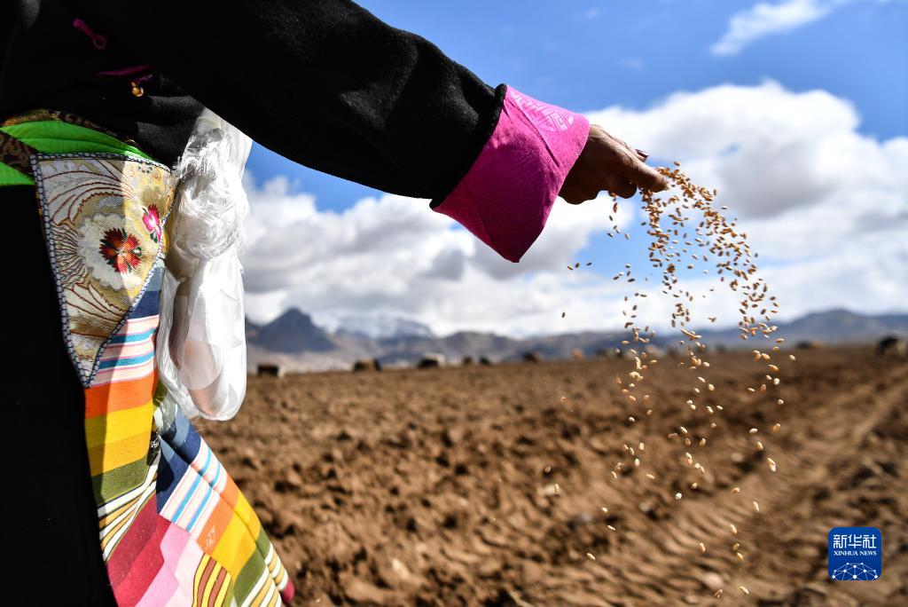 在西藏林周县强嘎村的春耕仪式上,身着盛装的村民在播撒青稞种子(3月16日摄)。