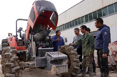 2月28日,在西平县老王坡高标准农田示范区,刘亚辉(右)和王英凡在对平移式水肥一体化喷灌机进行巡检。