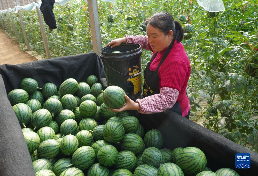 3月17日,在山东省邹平市西董街道“摩诃山西瓜”高效农业产业园,瓜农在采摘刚成熟的大棚西瓜,准备销往北京、广东等地。