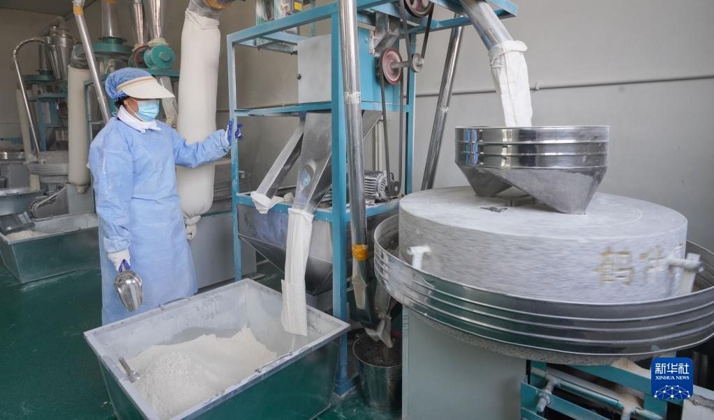 3月17日,在山东省邹平市西董街道郭家峪村鹤伴磨坊,工作人员在生产石磨面粉。