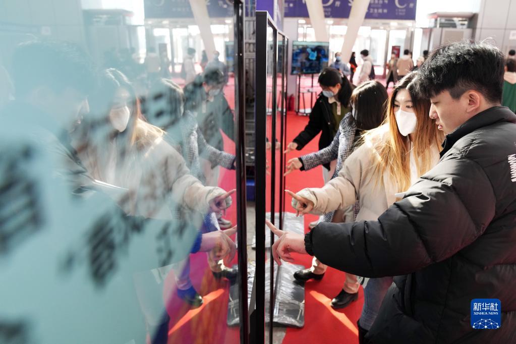 3月18日,求职者在招聘会的智慧屏区域进行求职检索。