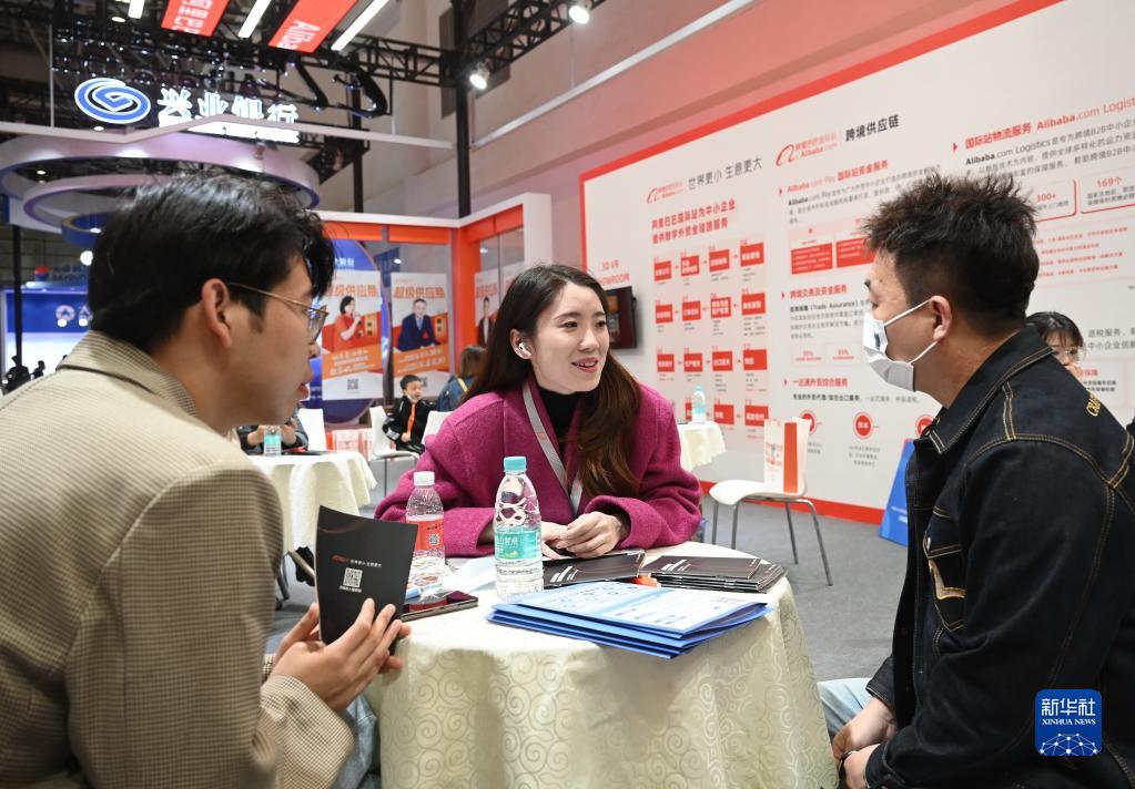 3月18日,阿里巴巴国际站工作人员(中)和参观者交流。