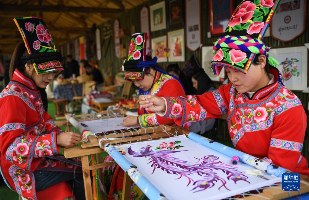 3月18日,宁强羌族刺绣的非遗传承人在2023中国最美油菜花海汉中旅游文化节的非遗展区展示技艺。