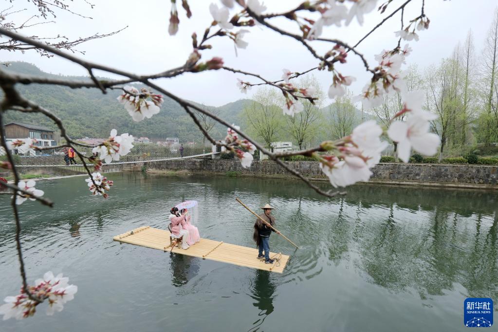 近日,浙江省湖州市德清县莫干山镇佛堂村的樱花竞相绽放,吸引众多游客前来游玩。近年来,佛堂村围绕樱花公园、亲水平台等打造水元素乡村游,助力乡村振兴。