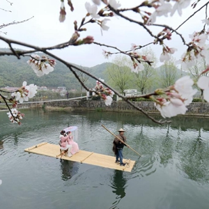 3月18日,游客在湖州市德清县莫干山镇佛堂村乘竹筏赏樱花。