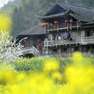 春暖花开时节,在鄂西山区湖北省宣恩县彭家寨风景区,绽放的油菜花仿佛给古吊脚楼群周边田园铺上一层色彩鲜艳的花毯,满园春色引来众多游人。