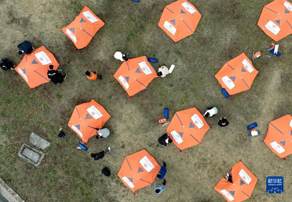 3月18日,在上海交通大学的野外生存劳动课上,学生们在校园大草坪上的“驻扎点”快速扎好帐篷(无人机照片)。
