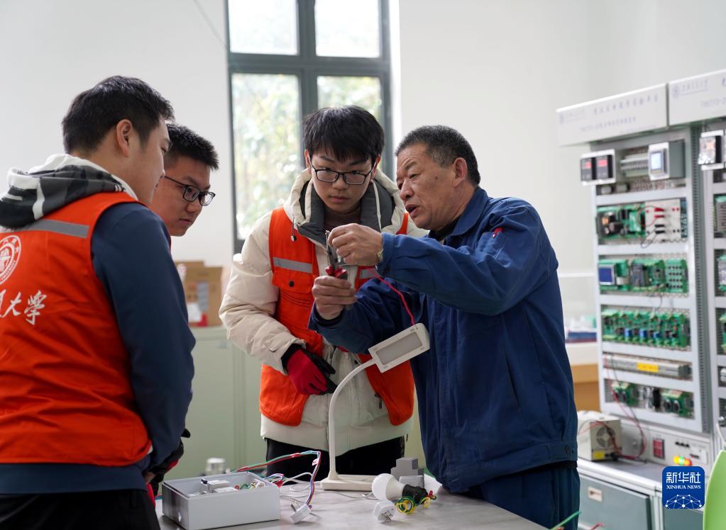 3月18日,在上海交通大学闵行校区的智能电网大楼,电工师傅潘国才指导学生组装智能配电箱。