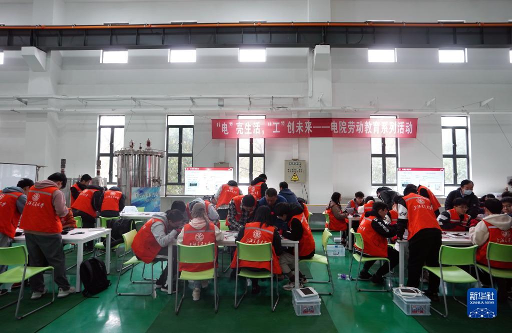 3月18日,在上海交通大学闵行校区的智能电网大楼,学生在学习组装智能配电箱。