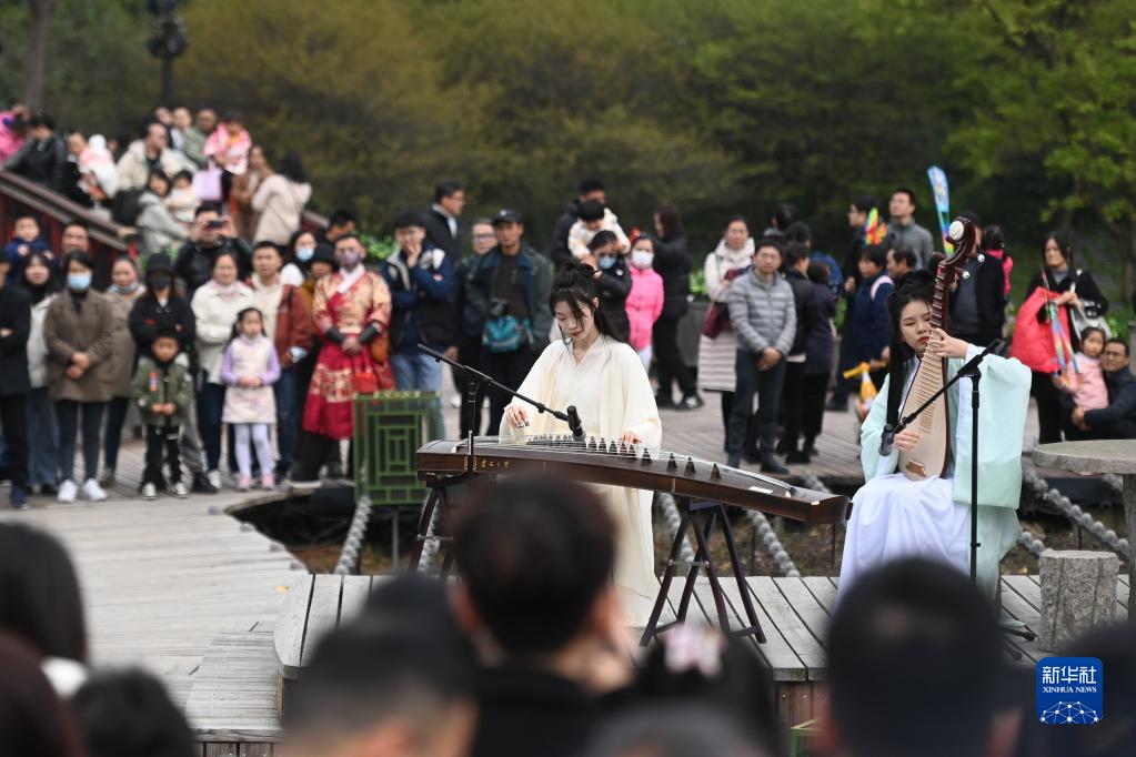 当日,2023西溪花朝节“簪花大会”在浙江杭州西溪国家湿地公园举行,市民和游客在充满宋韵元素的市集里体验,观看演出。
