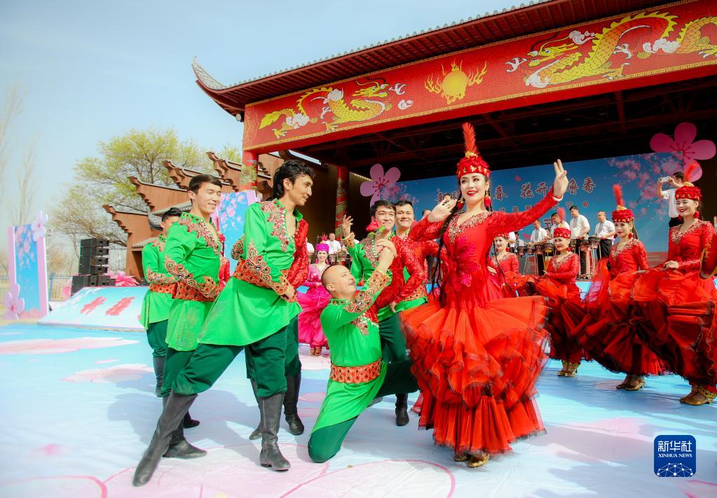 3月18日,演员在吐鲁番杏花节开幕式上表演。