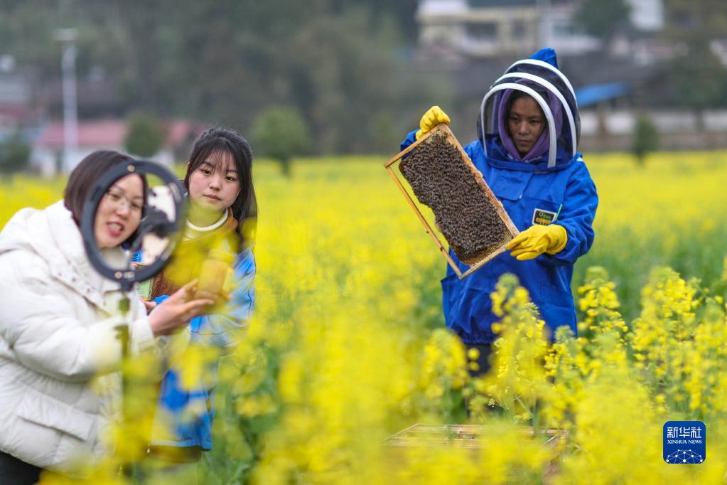 3月18日,岑巩县中等职业技术学校电子商务专业的学生在油菜花地里学习直播销售蜂蜜。