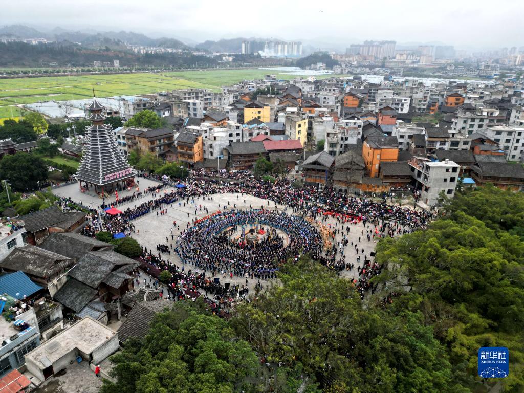 3月18日,榕江县侗族同胞在欢庆“萨玛节”(无人机照片)。
