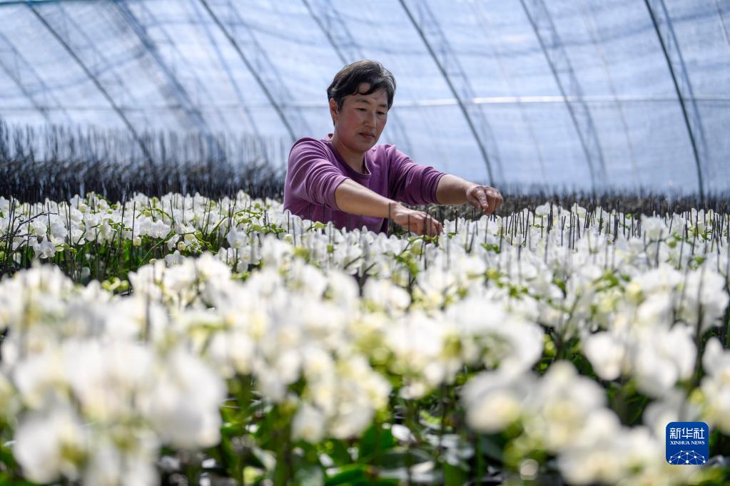 3月18日,在双滦区大贵口村一处大棚,农民在管护鲜花。