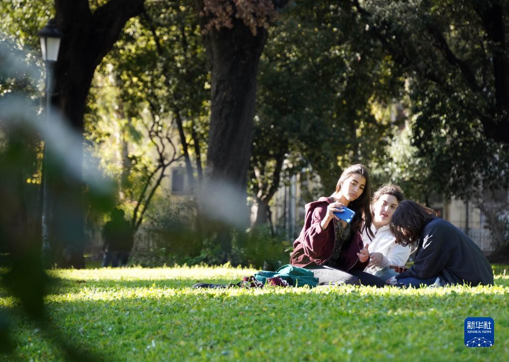 3月18日,人们在意大利罗马的一处公园休闲。