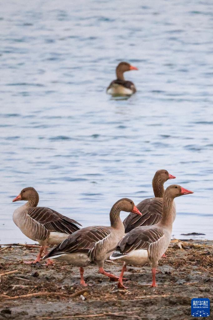 随着天气转暖,冰雪消融的新疆博斯腾湖迎来大批候鸟回归。