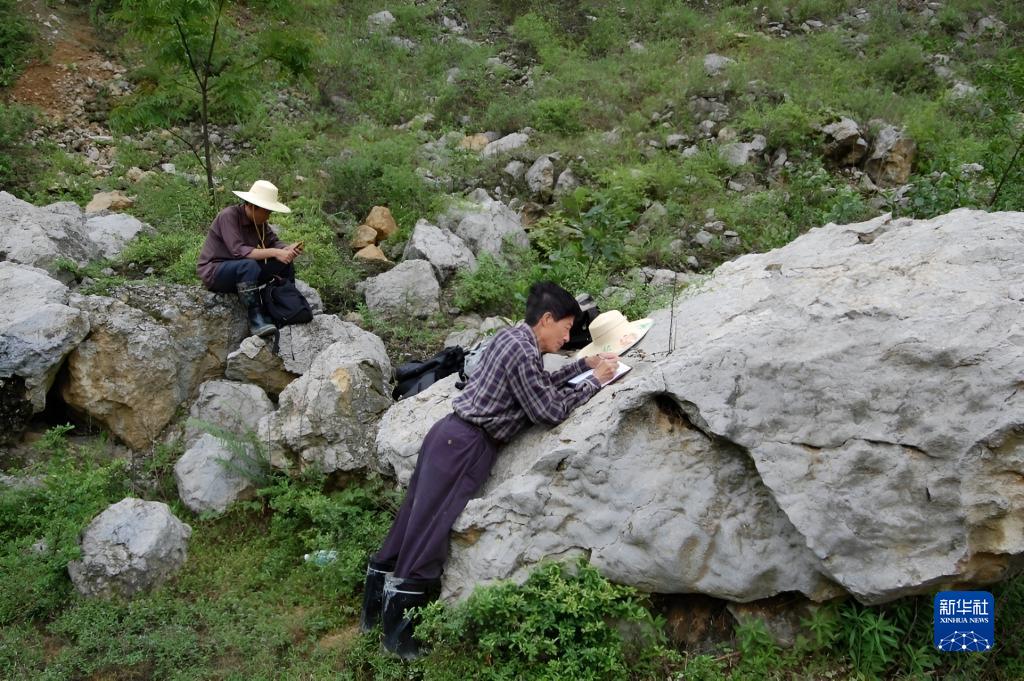 2008年,吴熙纯(右)在四川西北地区野外科考时趴在一处生物礁上做记录(资料照片)。