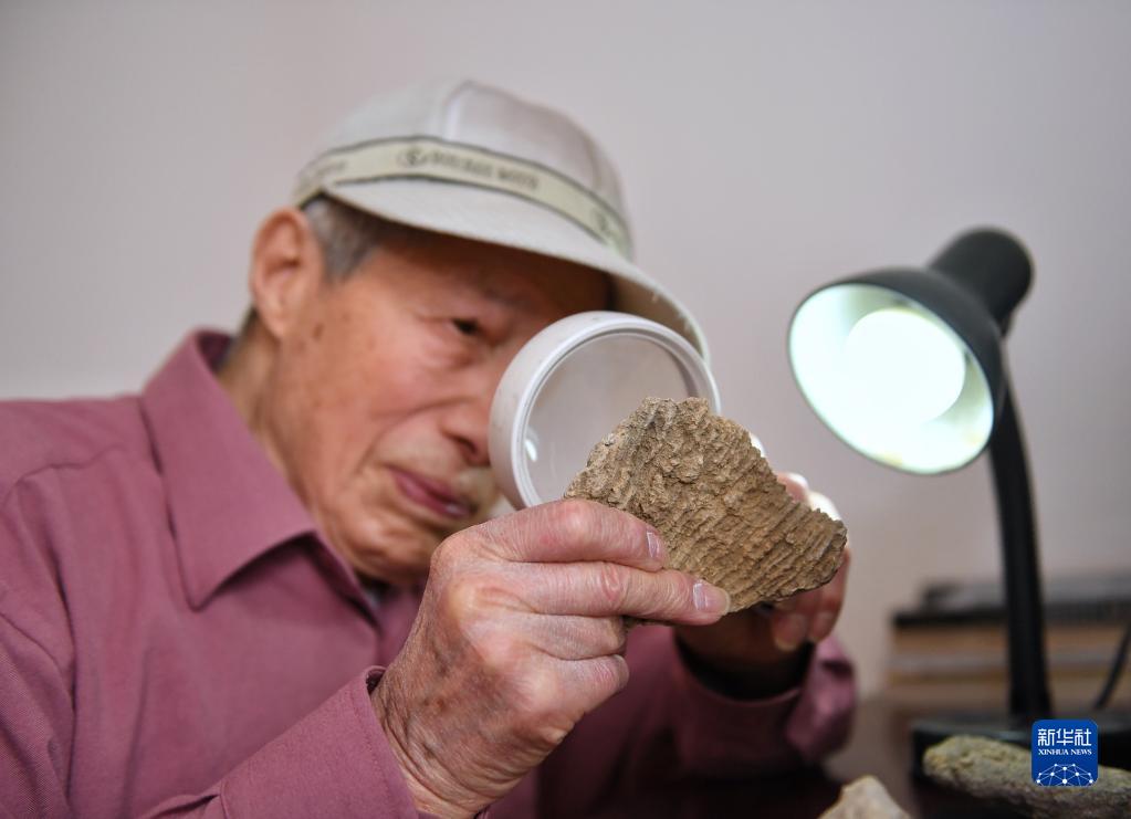 3月7日,吴熙纯在位于四川成都的家中观察一块三叠纪硅质海绵化石残片。