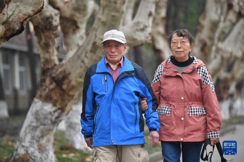 吴熙纯与爱人李培华走在成都理工大学校园内(2月27日摄)。