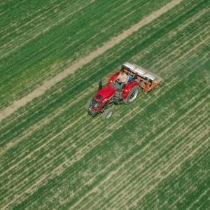 3月19日,河北省邢台市南和区贾宋镇宁营村农民驾驶农机播撒肥料(无人机照片)。