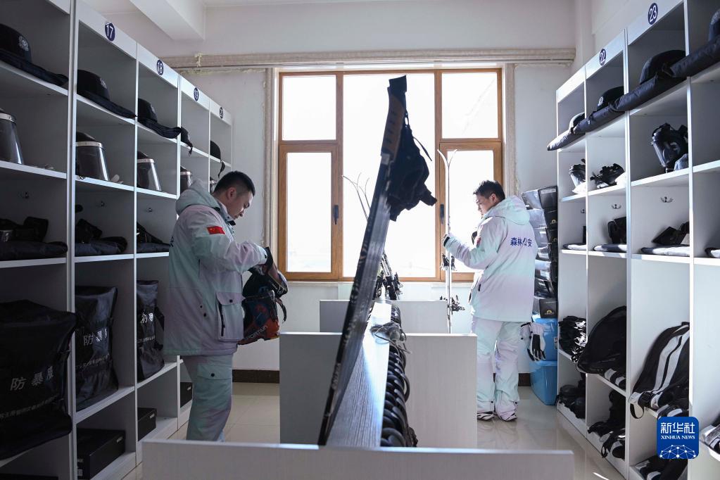 这是2023年2月7日,松江河森林公安分局雪上巡逻案件侦查大队的许重阳(右)和张迪在巡逻出发前准备雪具。