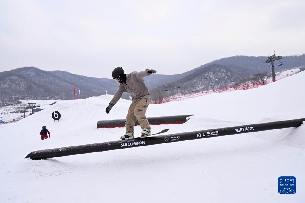 这是2023年2月11日,一名滑雪爱好者在地形公园体验“呲杆”。