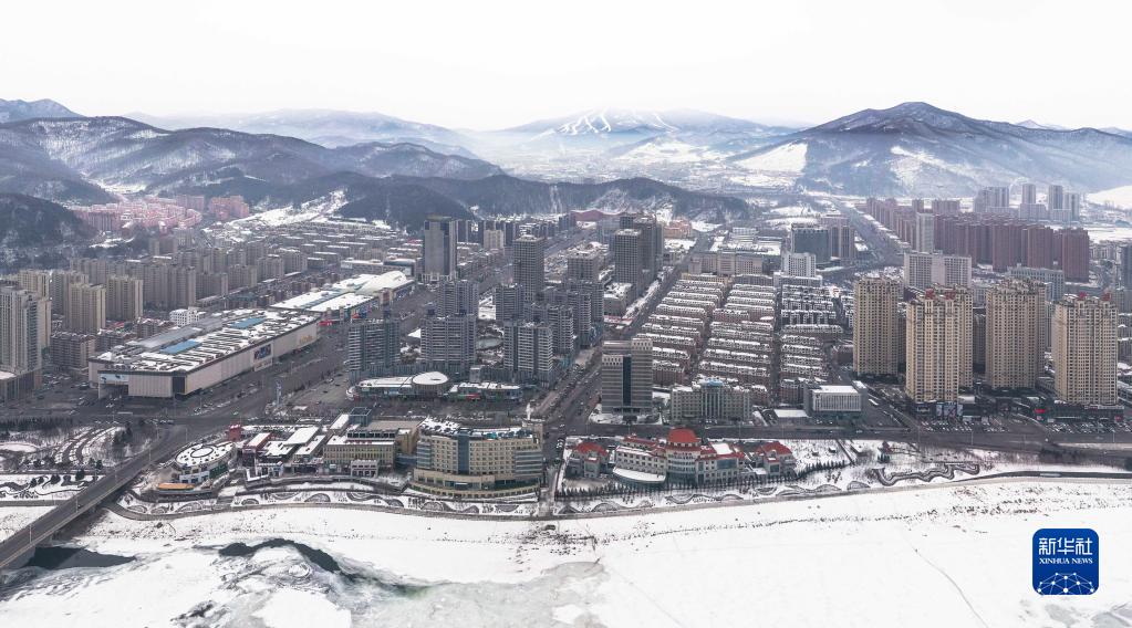 这是2023年2月10日拍摄的吉林省通化市城区和远处的万峰通化滑雪度假区(无人机照片)。