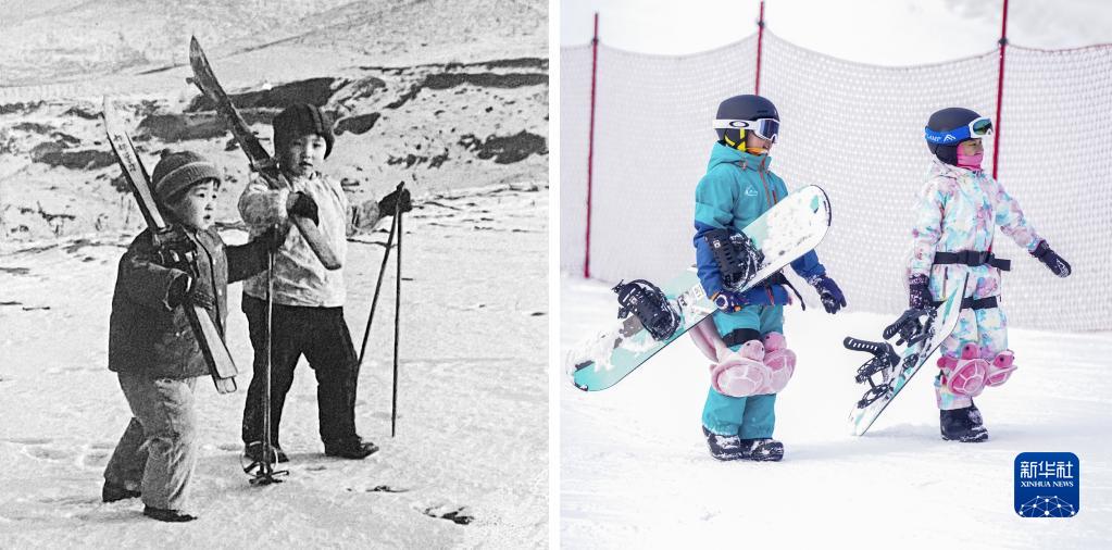 这是一张拼版照片。左图:1973年2月14日,吉林省通化市5岁的儿童吴小明(左)和于晓红(右),扛着滑雪板,来到市郊的山上学习滑雪(新华社发);右图:2023年2月10日,孩子们带着滑板走在万峰滑雪场(新华社记者颜麟蕴摄)。