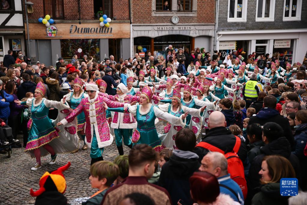 3月19日,在比利时东部的小城斯塔沃洛,人们参加狂欢节游行。